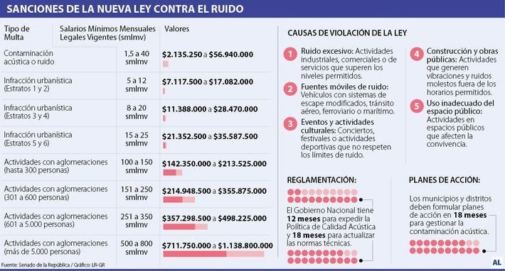 La ley impone sanciones a quienes infrinjan las normas de calidad acústica. Según el Artículo 19, las multas se dividen en generales y especiales, dependiendo de la gravedad de la infracción.